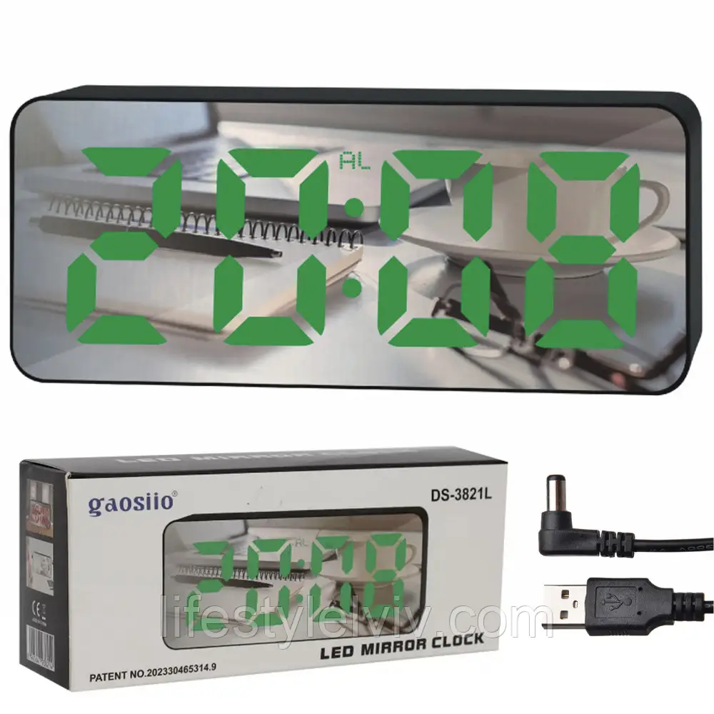 Ψηφιακό Ρολόι , Ξυπνητήρι Καθρέπτης με Οθόνη LED & Θερμόμετρο, Επιτραπέζιο DS-3821L Μαύρο με Πράσινους Αριθμούς